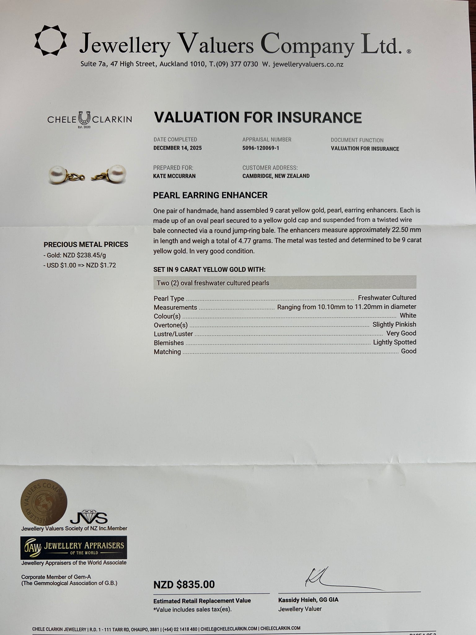 - Replacement value $835